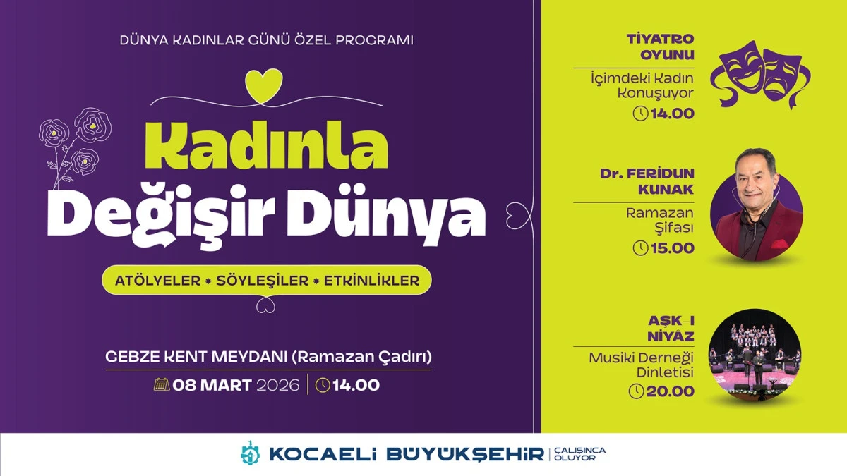 Kocaeli Büyükşehir Belediyesi tarafından hazırlanan “8 Mart Dünya Kadınlar Günü” programlarının ilki 7 Mart Cumartesi günü (yarın) Kocaeli Kongre Merkezi’nde, 8 Mart Pazar günü ise Gebze Kent Meydanı’nda kutlanacak. 7 Mart’ta Kocaeli Kongre Merkezi’nde düzenlenecek ana program, Büyükşehir Belediye Başkanı Tahir Büyükakın’ın katılımıyla gerçekleştirilecek. Programda kadınların toplumsal hayattaki rolü ile aile yapısındaki güçlendirici etkisi ve üretken kimliği ön plana çıkarılacak.