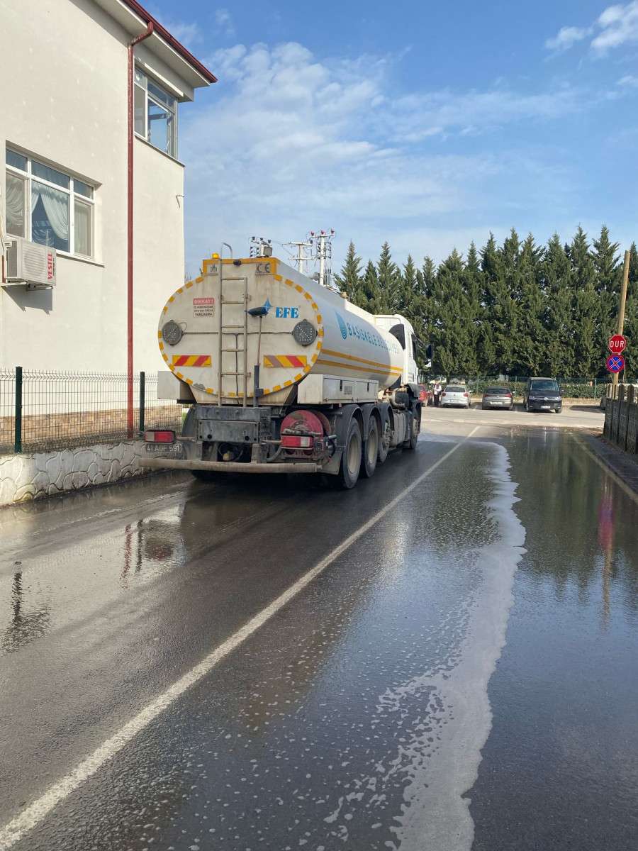 Temizlik İşleri Müdürlüğü’ne bağlı ekipler, ilçe sınırları içerisindeki cadde ve sokakları, kaldırımları biriken toz, toprak ve çamurdan arındırmak için tazyikli ve özel solüsyonlu suyla yıkıyor.