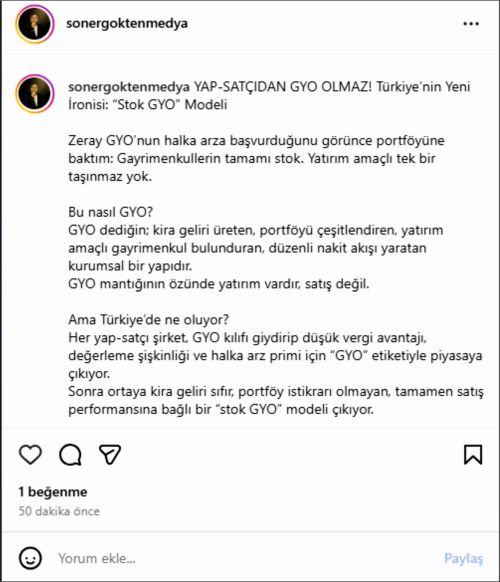 Ekonomi dünyasının tanınmış isimlrinden, özellikle finansal yatırımlar konusunda görüşlerine değer verilen Prof. Dr.Soner Gökten, halka arz başvurusunda bulunan ilimizin önde gelen inşaat şirketlerinden ZERAY GYO'nun halka arzını sosyal medyadaki köşesinden değerlendirdi. ''Yap-Satçıdan GYO olmaz'' diyen Prof. Dr.Soner Gökten'in yazısı şöyle ;