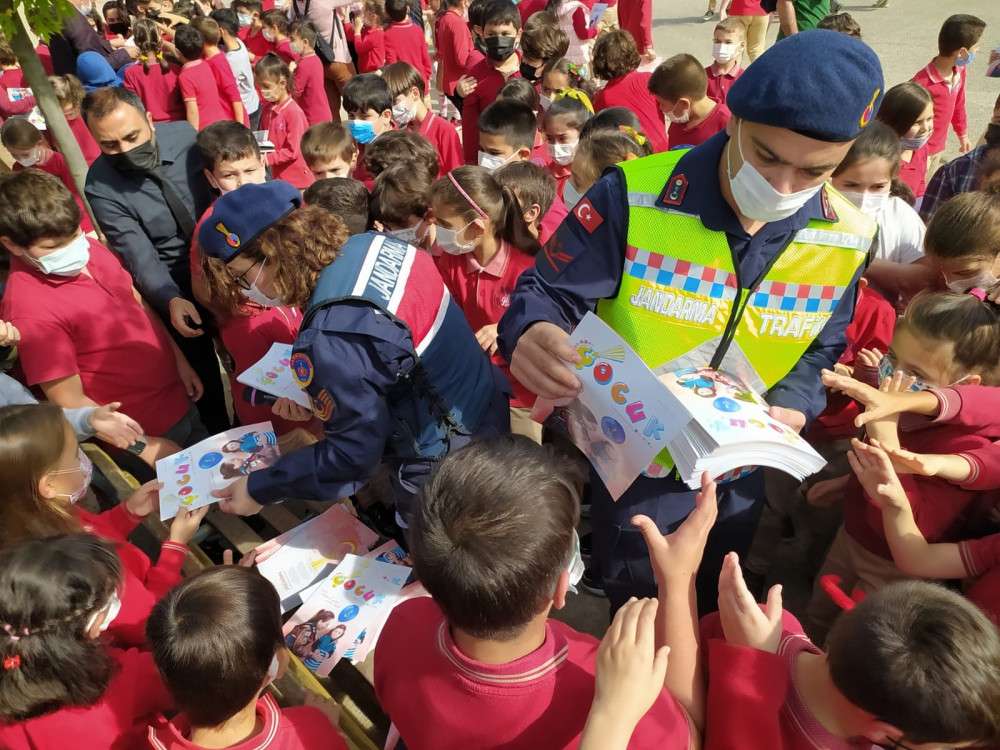 Kocaeli'de ilkokul çocuklarına trafik kuralları eğitimi veren jandarma ekipleri daha sonra ekip arkadaşları Kor ve Dev ile birlikte çocuklara eğlenceli anlar yaşattı.
