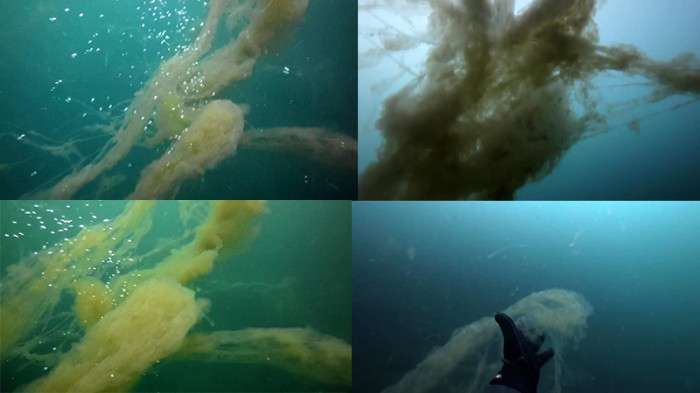 Hobi amacıyla zıpkınla dalış yapan bir vatandaş, İzmit Körfezi'nde müsilajla karşılaştı. Çektiği su altı görüntülerinde, deniz salyasının yer yer yoğunlaştığı görüldü.(İHA)