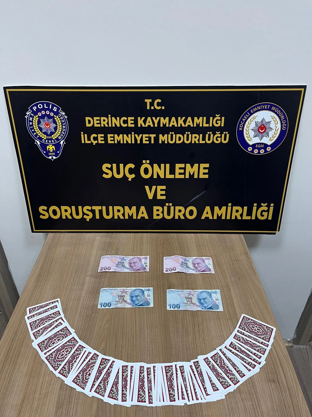 Kocaeli İl Emniyet Müdürlüğü tarafından 1 Kasım 2025 tarihinde Derince’de kumar oynanmasının engellenmesine yönelik yapılan çalışmalar kapsamında bir umuma açık yerde; 600 TL para, 104 adet iskambil kağıdı ele geçirildi. Konuyla ilgili suç aletleri ele geçirilen G.K., K.Ç., F.A., R.D., İ.Ü. ve S.Ö. isimli şüpheli şahıslar hakkında gerekli adli ve idari yasal işlemler yapıldı.