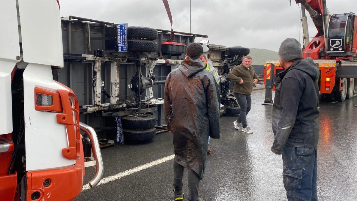KUZEY MARMARA OTOYOLU'NDA ŞİDDETLİ FIRTINA NEDENİYLE İKİ TIR DEVRİLDİ