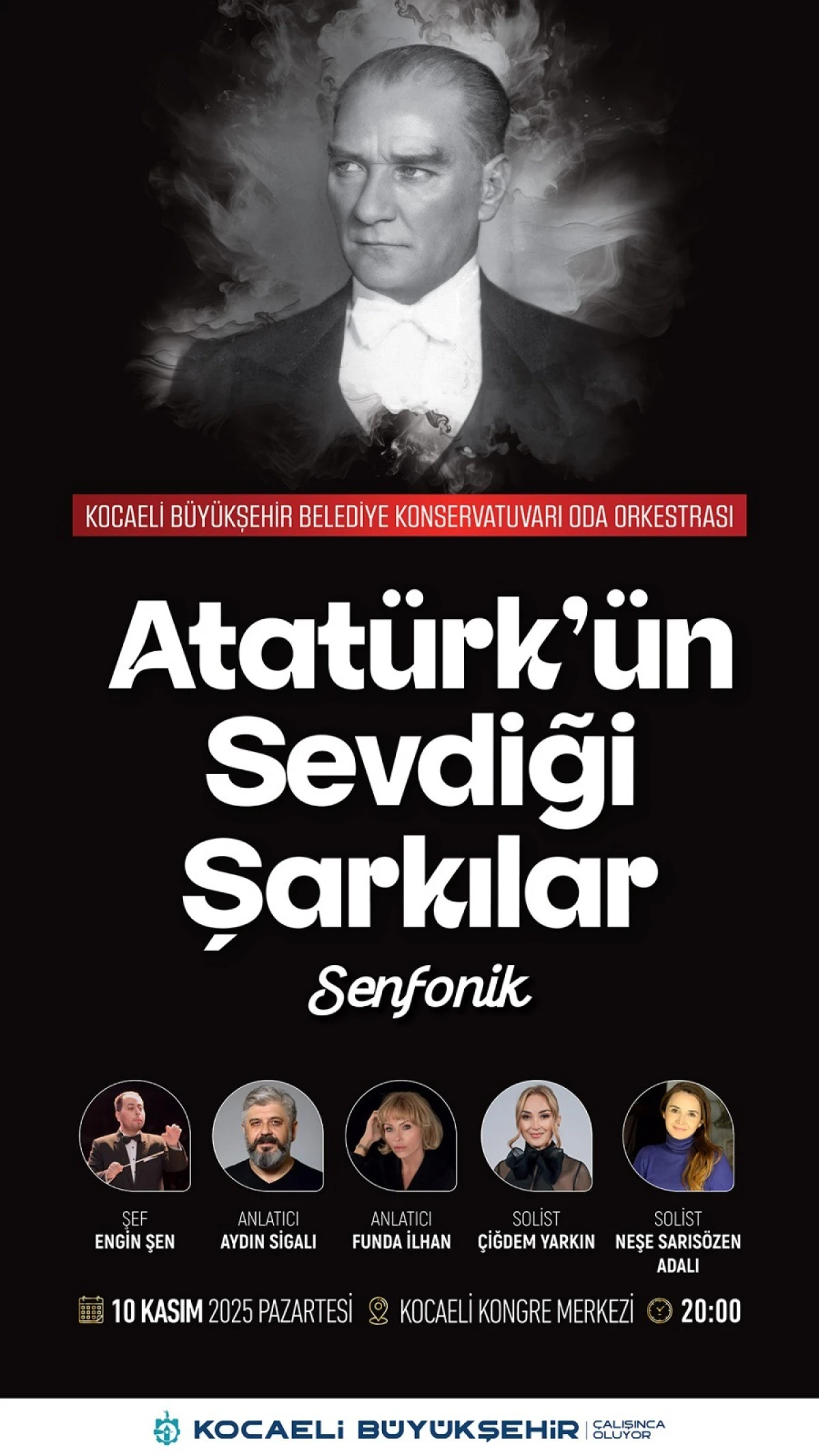 10 KASIM PAZARTESİ AKŞAMI KKM’DE Kocaeli Kongre Merkezi’ndeki konser 10 Kasım Pazartesi akşamı (yarın) saat 20.00’de başlayacak. Şef Engin Şen yönetimindeki Oda Orkestrasının solistliğini TRT İstanbul Radyosu ses sanatçısı Çiğdem Yarkın ve Büyükşehir Belediye Konservatuvarı Türk Sanat Müziği Bölümü eğitmeni Neşe Sarısözen Adalı yapacak. Belediye Konservatuvarı Türk Müziği Bölüm eğitmenleri de Oda Orkestrası’na eşlik edecek.   ŞEHİR TİYATROLARI SANATÇILARI ANLATACAK Seyirciler verilen küçük aralarda eserlerin hikâyelerini dinleme imkânı bulacak. Ata’nın sevdiği şarkıların hikâyeleri, Şehir Tiyatroları Genel Sanat Yönetmeni Aydın Sigalı ve Şehir Tiyatroları Oyuncusu Funda İlhan’ın anlatımıyla aktarılacak.