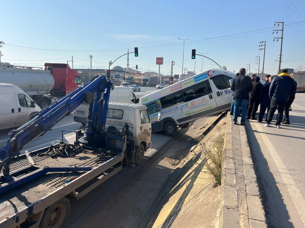 Yaralananın olmadığı kaza nedeniyle bölgeye polis ekipleri sevk edildi. Asılı kalan minibüs, çekici yardımıyla bulunduğu yerden kaldırıldı.