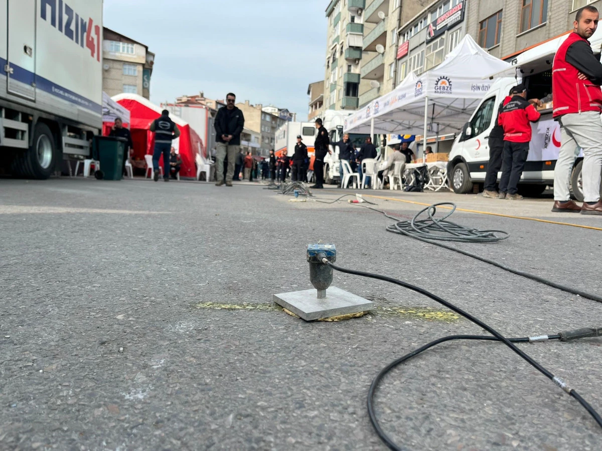 Gebze ilçesinde binanın yıkıldığı bölgede, uzman ekipler "sismik yansıma" yöntemini kullanarak ve ağırlık düşürmeyle sismik dalgalar oluşturarak yerin metrelerce derinliğini inceliyor.