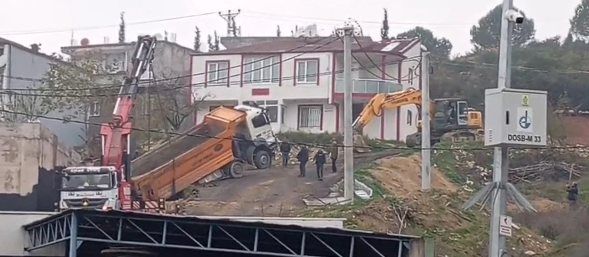 YÜK BOŞALTAN KAMYON ASKIDA KALDI