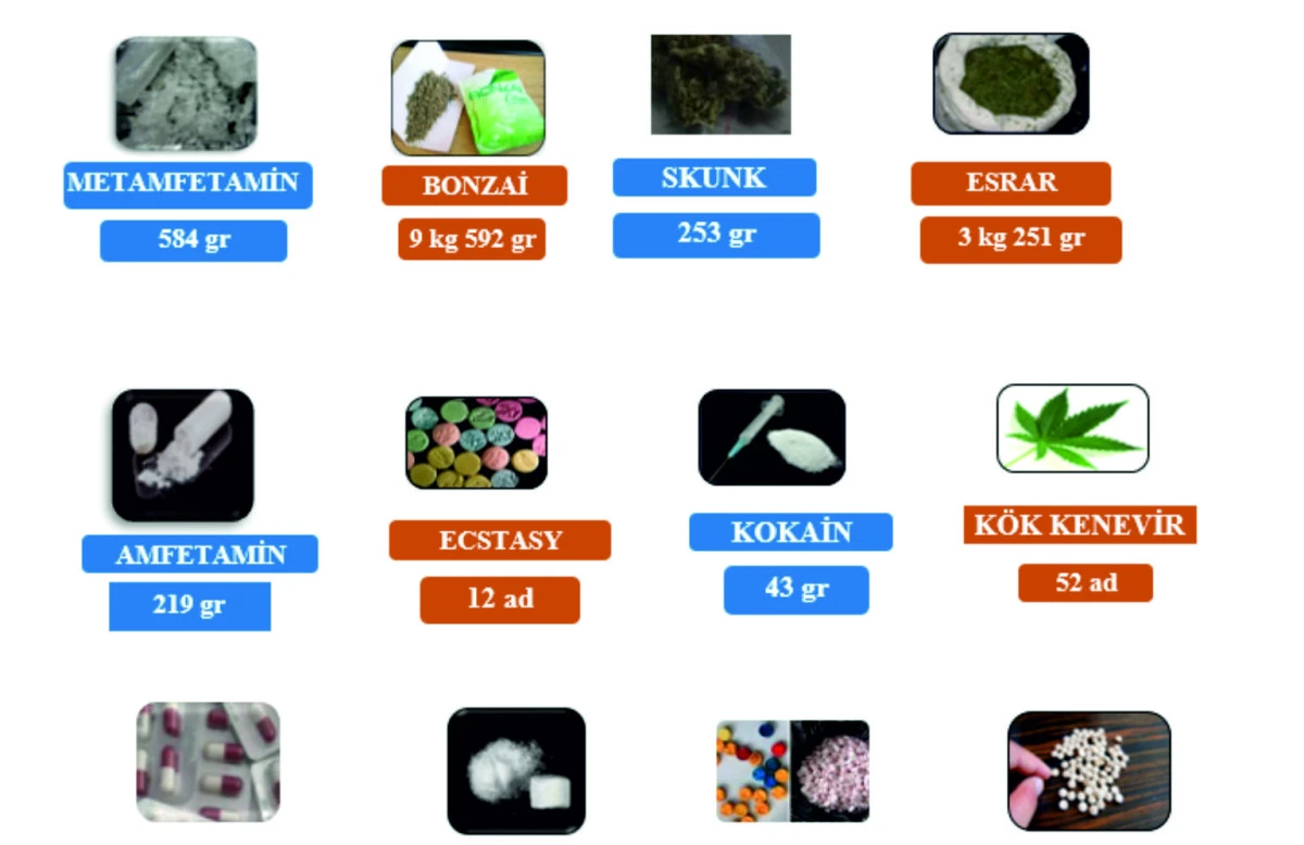 Emniyet operasyonlarında ele geçirilenler ise dikkat çekti: 1 kilo 666 gram esrar, 432 gram kokain, 409 adet ecstasy. Çok miktarda bonzai, metamfetamin ve sentetik ecza. Uyuşturucu ticaretinden elde edildiği değerlendirilen 61 bin 665 TL nakit para ve 5 adet hassas terazi.